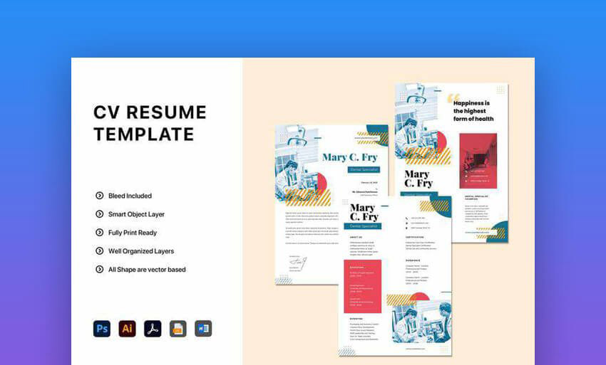 If you’re looking for a colorful resume template, this creative CV resume will come in handy. The template stands out with its full-color background and creative color splashes in the corners. Customize it to match your style. This template comes in Photoshop, Illustrator, and Word format.
