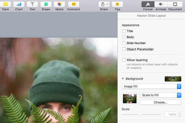 First, click on the Format tab on the right side of the Keynote window. You should see Background as one of the options. When you click on the arrow to display the options, you are able to select Image fill. You can upload your photo of choice and it will appear in the background of the master slide. Finally, you have to assure the photo fits correctly. Choose Scale to Fill as sizing option and we're all set!