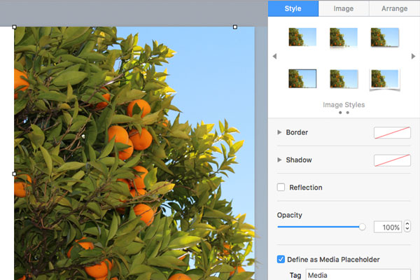 Now, finally let's add a photo which takes up the right side of the slide to complete the design. Similarly as we did with text before, you can check Define as Media Placeholder in the Style tab when you click on an image in order to make this easily changeable. Press Done to save your master slide.