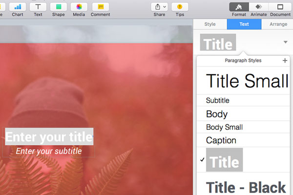 First, let's add a new slide to the deck by adding a new master slide. Right-click on one of your slides and add a new master slide. Remember the title paragraph style we created in the previous slide? Add text using the Text button in the top toolbar and use the dropdown to select the Paragraph Style 'Title' we've created.