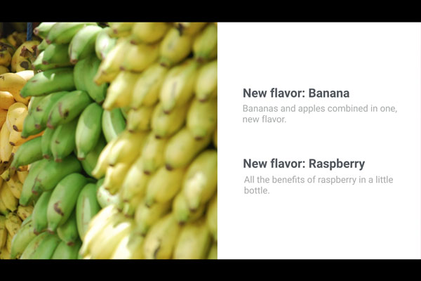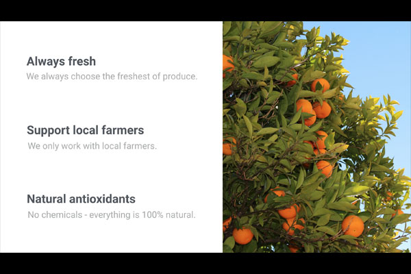 In our example we're using in this tutorial, we're creating a presentation design for a startup which sells bottled juices. The existing brand has a strong focus on warm colors as it's a product which is supposed to make people feel good about themselves. We can express these types of emotions through bold typography, warm colors and using photography in which people are in situations they feel happy.