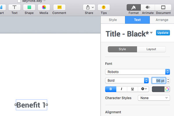 Considering that we would like to add three benefits on one slide, the font is a little bit too big. Let's reduce the font size back to 56pts.