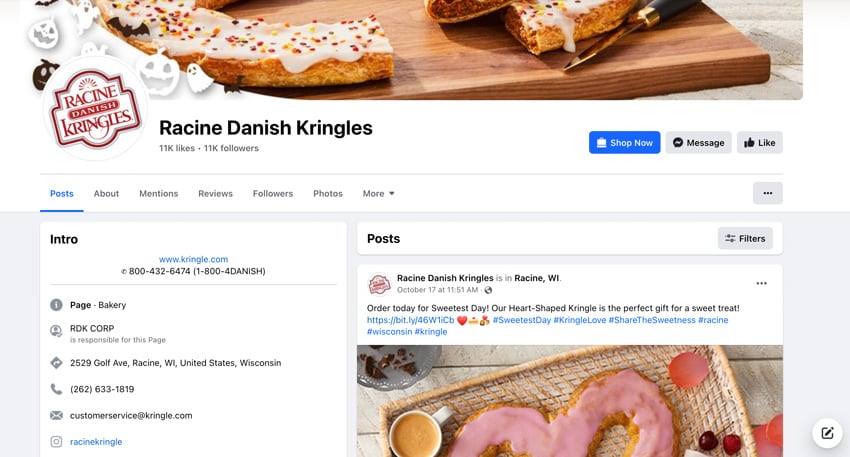 Also, for those social media networks that allow more than one link, don’t forget to include your other social media profiles there. Racine Danish Kringles does an excellent job of including their Facebook page in their bio along with their website.