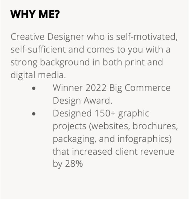 Use bullet points instead of paragraphs. Write in short sentences, up to two lines at the most. Use keywords, numbers, and power words to come up with punchy statements without fluff.