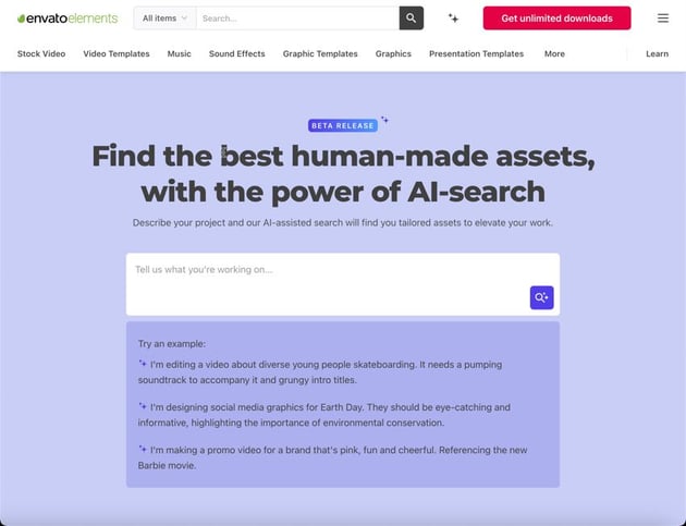 If you don’t know what elements you need for your creative project, try using the new AI search tool on Envato Elements. To use the tool, you enter your project details into the box. Next, the AI tool will suggest what digital assets can be used in your project.